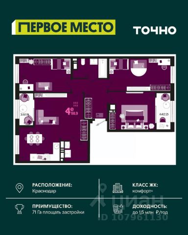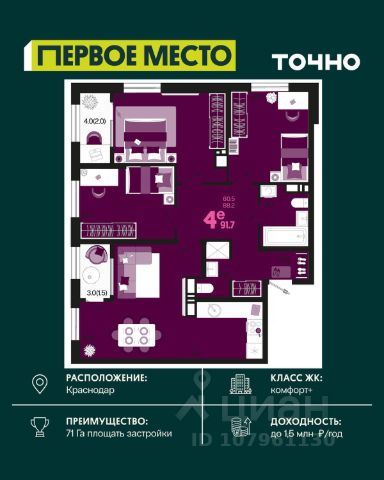 Продаётся 4-комнатная квартира в сданном доме (Дом 33Г), срок сдачи: IV-кв. 2022, общей площадью 114.7 кв.м., на 2 этаже. Development Plaza - мультиформатный проект, где качественная фундаментальная архитектура создает атмосферу успеха и вдохновения. Новый центр жилой и деловой активности. Здесь нужного вам бизнес-партнера гораздо проще встретить в ресторане, чем несколько недель искать его контакты через знакомых - скорее всего, он ваш сосед. Архитектура Фасад из травертина. Выполнен по индивидуальному проекту. Синтез архитектурных стилей привнес в Development Plaza европейскую атмосферу. Эксклюзив Окна в пол, окна в ванной, высокие потолки 3.6 м, студии, келлеры и роскошные 4-комнатные квартиры. Вариативность планировок и деталей - одна из уникальных характеристик Development Plaza. Play-zone спорт йога кинозал гамаки скалодром Свобода от границ Внутренний двор дома расположен на третьем уровне здания. Здесь созданы пространства для отдыха, творчества и впечатлений. Все спроектировано таким образом, чтобы дети росли здоровыми. Нетворкинг Жить в Development Plaza - значит быть частью большой истории, постоянно развивать собственные способности и строить нетворкинг в среде креативного класса и бизнес-элиты. Development Plaza органично сочетает в себе деловую и жилую среду. Достаточно двух минут, чтобы сменить домашнюю атмосферу на яркие ощущения от событий и перспективных знакомств. Премиальные холлы Уникальный авторский дизайн, дорогие натуральные материалы в отделке. Элементы системы умный дом для поддержания комфорта в местах общего пользования. Lounge-зона в каждом подъезде. Стойка консьерж-службы. Колясочные. Помещение для мойки лап питомцам. Квартиры Число квартир - 260. Широкая квартирография - от студий до 4 комнатных квартир евроформата. Высота потолков - 3,6 метра , возможность устройства 2го уровня в одной квартире. Предусмотрены варианты объединения квартир до 180 кв.м. Уникальные видовые характеристики. Квартиры с видом на Чистяковскую рощу, стадион Краснодар, центр города, в квартирах на юго-восточную сторону видно горы в ясную погоду! Квартиры на 3 стороны света! Некоторые квартиры имеют большое видовое окно в ванной комнате. Высокая обеспеченность квартир келлерами- современными европейскими местами для хранения. Большие панорамные окна. Высота окон во всех квартирах - 2,3 м. На трех верхних этажах окна имеют остекление в пол Во всех квартирах остекление из комнат на лоджию полностью в пол, отопительные приборы убраны на стены рядом Дизайн-проект в подарок всем покупателям. Инновации и безопасность В комплексе трехуровневый подземный паркинг на 263 машиноместа с возможностью спуститься к автомобилю на лифте. Система интеллектуального управления при въезде на территорию комплекса обеспечивает доступ в паркинг только для своих. Современные технологии безопасности на основе интегрированной IP-системы позаботятся о спокойствии жителей Development Plaza. В комплексе поэтажный контроль дост