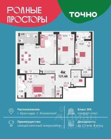 Жилой комплекс представляет собой 9 корпусов высотой от 5 до 18 этажей. В оформлении фасадов используются облицовочный кирпич. Во всех домах выполнена дизайнерская отделка входных групп и установлены современные лифты. В каждом корпусе спроектированы места для хранения колясок и велосипедов, в холле оборудована лапомойка для домашних животных. В проекте представлено множество планировочных решений: в наличии квартиры, как классического типа, так и европланировки. Сдаются они с чистовой отделкой. Высота потолков — от 2,7 до 3 метров. На территории комплекса предусмотрены места для отдыха, аллеи и бульвары, детские и спортивные площадки. На первых этажах расположены коммерческие помещения. Для владельцев автомобилей спроектированы стоянка и отдельный многоуровневый паркинг. ЖК расположен в районе Хлопчато-бумажного комбината. В шаговой доступности готовые объекты социальной и спортивной инфраструктуры города: центры детского творчества, ледовый каток, концертный зал, образовательные учреждения и детские сады, торговые центры, парки, медицинские учреждения. До центра города 20 минут транспортом.