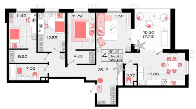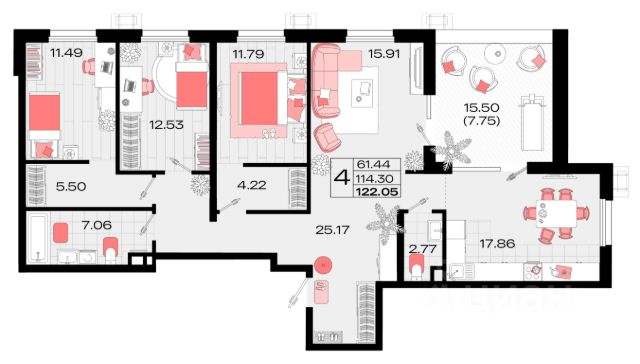 - 4 просторные комнаты;