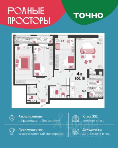 Продаётся 4-комнатная квартира в сданном доме (Дом 1 Корпус 5), срок сдачи: III-кв. 2018, общей площадью 237.4 кв.м., на 25 этаже. "Седьмой континент" это семь 25-этажных башен, построенных в центральной части Фестивального микрорайона Краснодара. Он расположен близко к центру и отличается современной архитектурой: среди пяти- и девяти-панельных домов появляются всё новые жилые комплексы, здесь же построен известный в городе коттеджный поселок "Поле чудес". Рядом находится два сквера: Видный и Майский, в пешей доступности ботанический сад им. Косенко. Вблизи комплекса останавливаются автобусы, маршрутки и троллейбусы, на которых можно доехать до автостанции, железнодорожного вокзала или любого района Краснодара.
