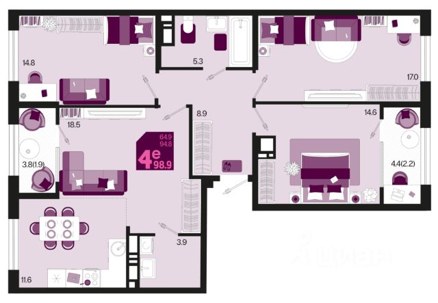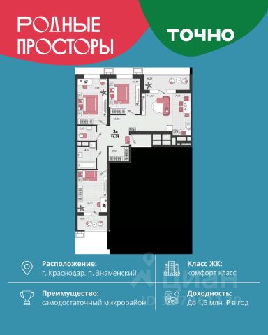 В состав комплекса "Седьмой континент" входит семь 25-этажных монолитно-каркасных башен. Высота потолков от 2,8 м до 3,0 м в зависимости от этажа. В холлах и вестибюлях можно увидеть качественную дизайнерскую отделку и изысканные интерьеры: кожаные кресла со столиками, зеркала, хрустальные люстры. В каждом подъезде установлено четыре скоростных лифта немецкого производства: два пассажирских и два грузовых. Дом оборудован системами очистки воды, проведены цифровые телефонные линии, кабельное ТВ и скоростной интернет. Предусмотрены системы вентиляции и пожаротушения, подъемники и пандусы для людей с ограниченными возможностями передвижения. Оплата коммунальных услуг доступна через мобильное приложение. Квартиры сдаются в состоянии "под чистовую отделку": со стяжкой на полу и штукатуркой на стенах, входной качественной металлической дверью, застекленными окнами и лоджиями, работающей системой отопления, а также вводом в квартиру пластиковых труб водоснабжения, электричества до щитка (без разводки по квартире), кабелей телефона, интернета, домофона и ТВ. Проблем с парковкой у жителей ЖК "Седьмой континент" 600 мест в подземном паркинге, 375 мест гостевая парковка на территории комплекса, 200 мест на открытой автостоянке рядом с комплексом. Также идет строительство многоуровневой парковки рядом с комплексом. Во дворе обустроены детские и спортивные площадки с современным нескользким покрытием, футбольное поле, фонтан, зоны отдыха. Территория закрыта, осуществляется круглосуточный мониторинг и видеонаблюдение участка. Дом обслуживает профессиональная управляющая компания. Продается 4-комнатная квартира от застройщика в Краснодаре.