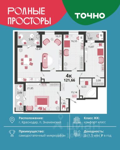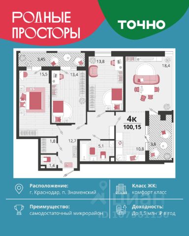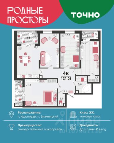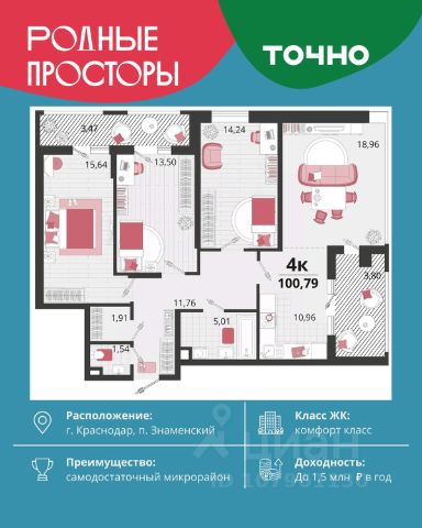 "Родные просторы"- самодостаточный микрорайон, который реализован по принципу комплексного развития территории, где есть вся инфраструктура для комфортной жизни. На территории 41 га 29 домов от 9 до 24 этажей, уютные дворы со спортивными и игровыми площадками, социальные и коммерческие объекты, зеленые массивы и фонтаны. Главная точка притяжения "Родных просторов" - парк семейного отдыха площадью 9 га, 4,5 км прогулочных аллей, амфитеатр для мероприятий, кинофестивальная площадка. Особая гордость микрорайона современная школа на 1550 мест и 3 детских сада "Ладушки", "Веснушки" и "Топотушки" на 880 малышей. В центре микрорайона строятся фитнес-клуб BALANCE с акватермальным комплексом и собственная поликлиника, площадью более 5000 кв.м. Уже открыт православный храм Святых Первоверховных апостолов Петра и Павла.