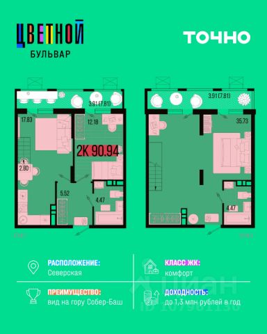 "ЖК "Цветной бульвар" — расположен в живописной станице Северская Краснодарского края и занимает территорию более 24 гектаров. Это семь кварталов комфортной среднеэтажной застройки (58 этажей), где каждый найдёт идеальную квартиру: от уютных студий до просторных двухуровневых апартаментов с террасами и видом на гору Собер-Баш. Главное пространство комплекса — зеленый бульвар длиной 460 метров с прогулочными аллеями, фонтаном, зонами отдыха и спортивными площадками. Здесь приятно гулять всей семьёй и проводить время на свежем воздухе. На территории предусмотрены современные детские площадки с безопасным покрытием, воркаут-зоны, трёхуровневое ландшафтное озеленение с газонами и кустарниками, уютные дворы без машин, более 5 000 м² коммерческой инфраструктуры, а также детский сад на 350 мест и новая школа с музеем и STEAM-лабораторией. "Цветной бульвар" — это новый уровень комфорта, где природа и современная архитектура создают пространство для счастливой жизни."