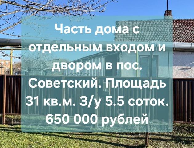 Продается в пригороде Ейска (23км) в пос.Заря 1/2 часть коттеджа пл.53кв.м. В доме три комнаты, кухня, сан.узел(совмещенный), прихожая. Высота потолка 2,7м, окна металлопластиковые, отопление индивидуальное-газовое. Подъезд к дому асфальтированный. Во дворе имеется гараж, хоз.постройки, баня. Поселок небольшой, но ухоженный, есть магазин, свой клуб, мед.пункт, регулярно в течении дня ездит автобус в город. Ближайшая школа и дет.сад в 4км в пос.Советский, возит свой автобус. Продажей занимается АН Форум, звоните, покажем в удобное время по предварительной договоренности.