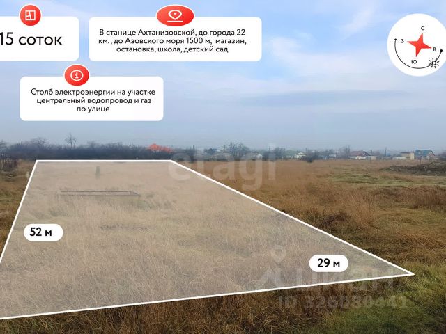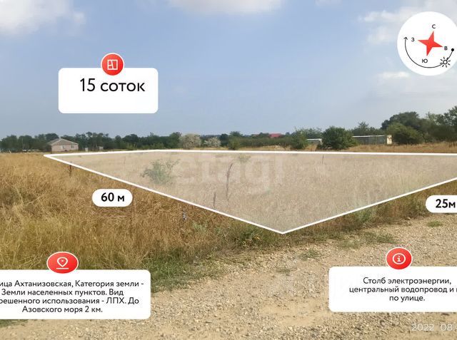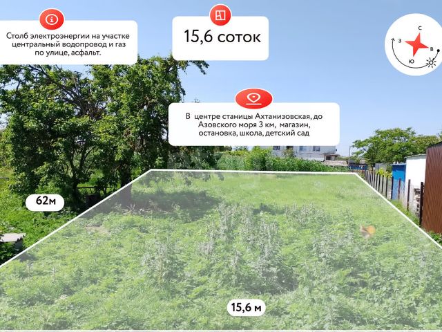 Покупайте участок! Ведь в данной локации вы найдете тишину и уют. А в нескольких минутах езды можно с удовольствием провести выходной день с удовольствием! Характеристики: Площадь участка 5,5 сотки Размеры по фасаду 18 метров, в глубину 28 метров Рельеф ровный, правильной формы Категория земель населенных пунктов, предназначен для строительства жилого дома. Коммуникации: К участку подведено водоснабжение Линия электроснабжения с возможностью подключения до 15 кВт рядом с участком Газификация заведена на массив и соседи уже подключились! Подъездные пути к участку, это хорошая дорога, отсыпанная щебнем! --- Юридическая чистота: Отсутствие обременений (арестов),Продажа от СОБСТВЕННИКА Отсутствие судопроизводств по субъекту и объекту Весь пакет документов Готовы к проверке и к дополнительным сборам документов, если потребуется . --- Инфраструктура: До Детского сада 1.3 км До школы 1.6 км. До Сетевых магазинов Магнит и Пятерочка 1.5 км. До центральной улины Ленина 1.1 км --- Локация: До Крыма 65 км. До Черного моря 30 мин езды До Темрюка 20 км. До Азовского моря 10 мин езды До Анапы 60 км До Краснодара 140 км. --- Достопримечательности: Ахтанизовский лиман. Один из крупных пресноводных водоёмов Краснодарского края. Площадь лимана — около 90 кв. км, глубина — не более 1,5 м. Берега поросли тростником, в зарослях которого встречаются розовые лотосы и кубышки. Также здесь растёт редкий водяной орех — чилим. Ахтанизовский вулкан Плевак. Сопка поднимается на 65 м с лишним над уровнем моря. Это действующий грязевой вулкан, на вершине которого можно увидеть нашлёпку серо-голубой глины. Грязевое озеро Синяя Балка. Представляет собой округлый кратер диаметром примерно 17 м. Целебная серая глина, которая его заполняет, имеет достаточно большую плотность, чтобы в озере можно было купаться, несмотря на его глубину — 25 м. Долина лотосов. Лотосы в Ахтанизовской высаживались искусственно, но сегодня так разрослись, что стали одной из красивейших местных достопримечательностей. Во время цветения лиман буквально покрыт ковром из этих растений. Гора Тиздар. Вдаётся небольшой возвышенностью в Азовское море. На обнажённых участках горы видны пласты глины различного цвета. Грязевой вулкан Тиздар имеет кратер диаметром 1520 м с жидкой грязью. --- Звоните сейчас и завтра станьте обладателем участка в перспективном районе! Участок подойдёт для дачи.