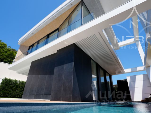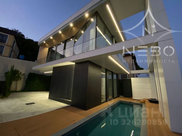 Участок включает площадку для нескольких машин, террасу для отдыха, барбекю, душевую, есть открытый переливной бассейн "Инфинити". По всей территории выполнено озеленение с автоматическим поливом, ночная подсветка клумб и фасада.