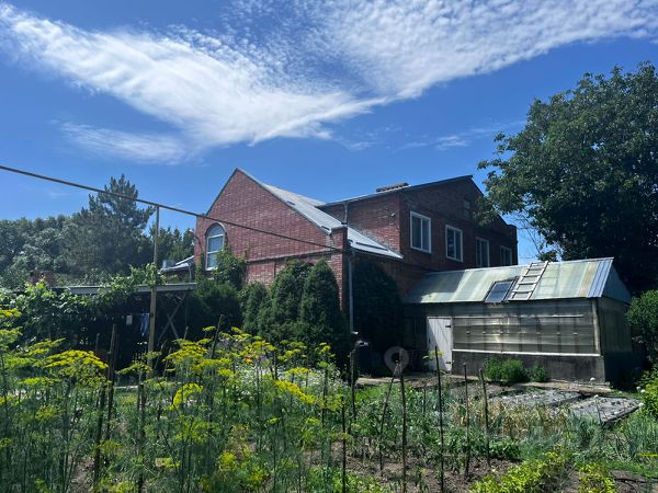Дом и участок с хорошей энергетикой, богатейшим цветником и садом: яблони, груши, абрикос, крупные грецкие орехи, ирга, вишня, персики, слива, малина, земляника, клубника, смородина всех цветов, крыжовник, ежевика, фундук, сливы и т.д. Отличная коллекция цветов ранней весны для поздней осени - всё в цвету! Участок ровный, огород разделён ручьём (грунтовых вод нет), при желании можно держать водоплавающих птиц (гуси, утки), есть деревянные сарайчики. Есть кирпичный сарай с вторым подвалом. Второй дом на подворье саманный, в нём держала птицу (служит как сарай). Деревянный навес под машину; кирпичная баня.