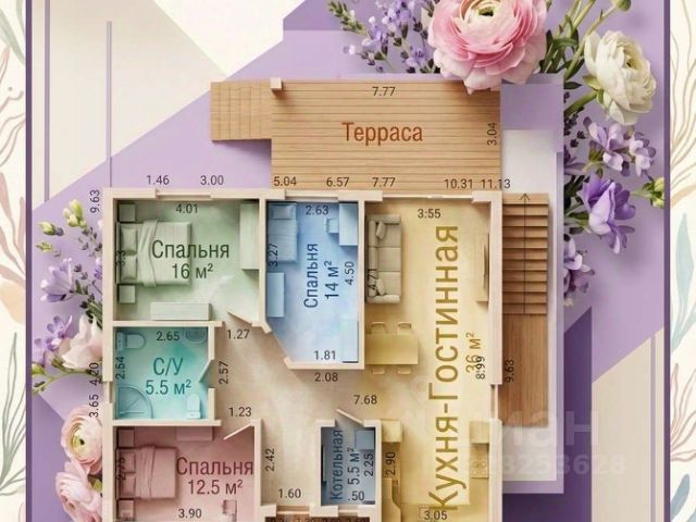 Планировка: светлая кухня - гостиная с выходом на террасу, 2 спальни, гардеробная, бойлерная, прихожая, санузел, чердачное помещение со складной лестницей, крыльцо. Теплый пол.