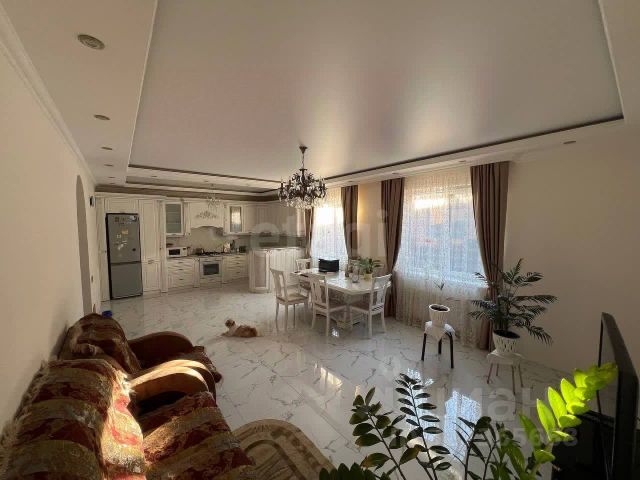 На первом этаже кухня-гостиная 40 м кв, две спальни по 15 метров, санузел, три входа для удобства, большой красивый и ухоженный зимний сад. В зимнем саду мандариновые деревья и лимонные дают хороший урожай.