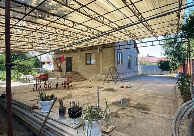 Навес над двором 180 кв.м. из полупрозрачного оргстекла. Двор забетонирован. С стороны улицы краснокирпичный забор высотой 2 метра, ворота для машин и калитка.