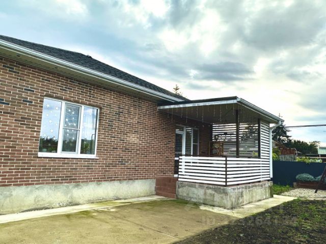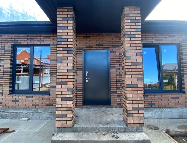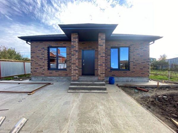 Дом возведен полностью из кирпича, высокий цоколь, металлопастиковые окна, кровля — металлочерепица, большая застекленная лоджия-веранда.