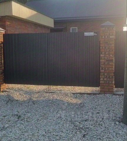 Дом расположен на 4 сотках земли, назначения СНТ, участок огорожен по периметру забором, с фасадной стороны — кирпичные колонны, евроштакетник, откатные ворота, калитка, фасадная подсветка забора и самого дома.
