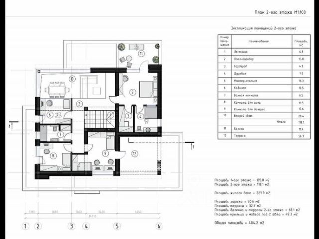 Второй этаж: холл с выходом на балкон, кабинет, три спальни, просторный зал 37 м свободного назначения (можно оборудовать бильярдную или спортзал)