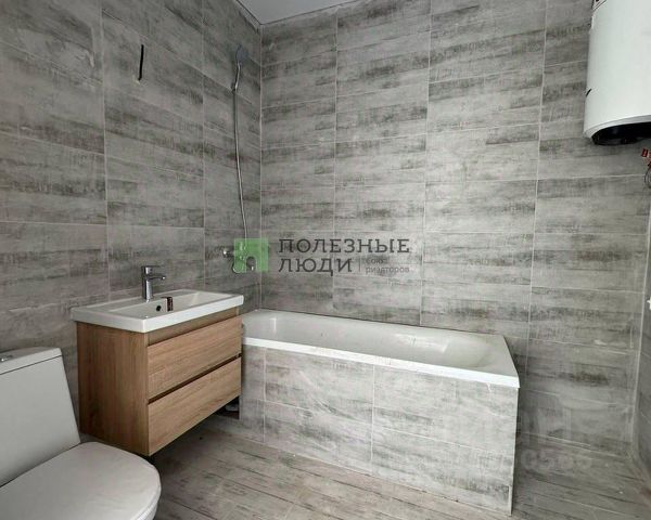 Ванная комната отделана керамической плиткой, установлена сантехника, душевая кабина, мебель для ванной комнаты.