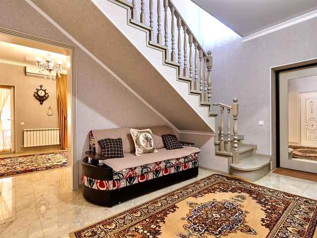 На втором этаже: кухня-гостиная, три спальни, санузел с ванной, дополнительный санузел, большая прихожая, чердак. Вход на второй этаж отдельный, лестница с красивыми перилами и козырьком перед входом.