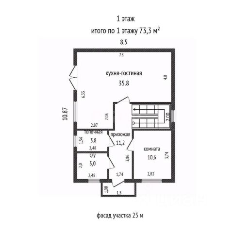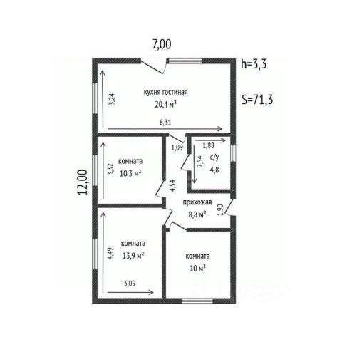 Одноэтажной коттедж общей площадью 75 кв.м современной планировки: прихожая, холл 8,6 кв.м, три изолированные спальни 10 кв.м, 11,5 кв.м, 12,3 кв.м, совмещенный санузел 5,1 кв.м, кухня-гостиная 24 кв.м.
