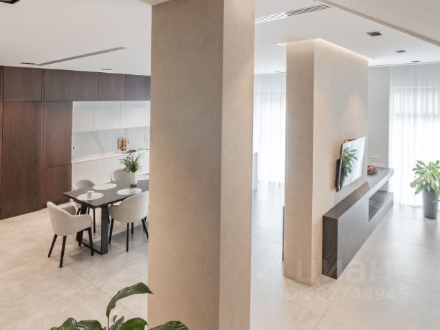 В кухне-гостиной установлен кухонный гарнитур со встроенной бытовой техникой, посудомоечная машина, обеденная группа, мягкая зона.
