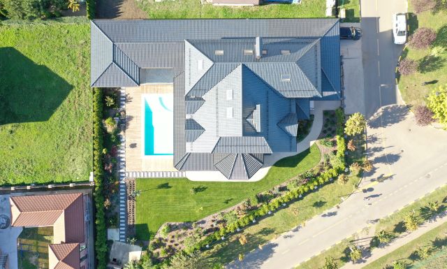 Максимальное использование в строительстве только качественный и натуральный материал: черепица ручной формовки LA Eskandella, окна стеклопакет натуральное дерево дуб, стены кирпич, архитектурные элементы фасада и интерьера натуральный камень, забор по периметру 160 м. натуральный гранит. - В ландшафте использовано более 80-ти тонн мраморной и гранитной крошки и камня. -Собственная скважина с водой, собственный генератор.