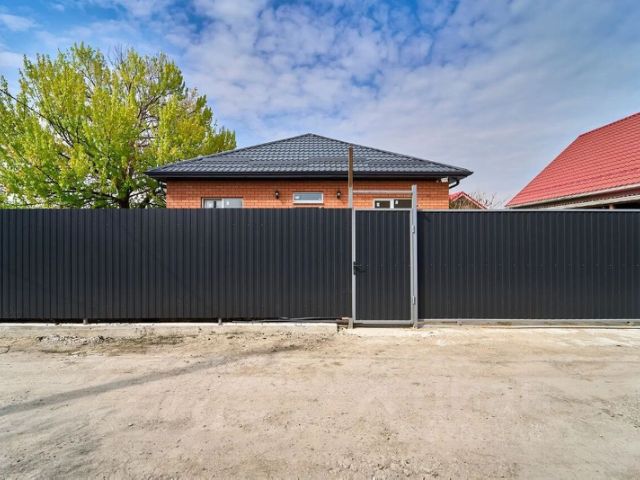 Участок правильной квадратной формы, с большой территорией заднего двора за счет правильного расположения дома. По периметру дома сделана отмостка. Ворота откатные.