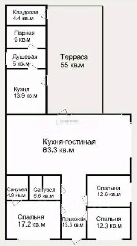 Площадь дома 79,8 кв. м. В отдельном здании кухня, сан. узел, гараж 55 кв.м. (см. план)