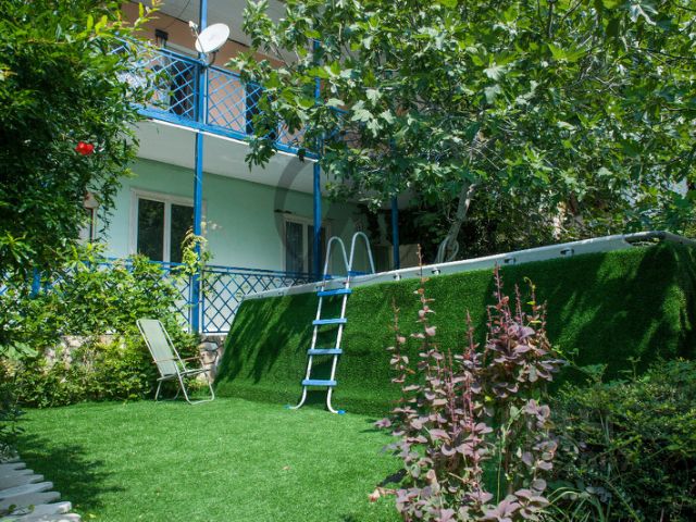 Шикарный бассейн и потрясающий вид на море, благоустроенная территория, парковка, зона отдыха с мангалом, батутом и качелями.