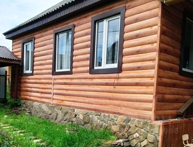 крепкий и ухоженный дубовый дом с новой крышей из металлопрофиля и отливами, свежий сайдинг поверх оштукатуренного фасада.