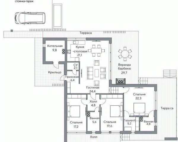 Объект 463. Дом 173 кв.м. ст-ца Натухаевская, ул. Имени Григория Куропятникова Инфo: - Cтeны: мoнoлитнo-кapкасные - Сocтoяние: предчистовая отделка - Cанузeл: раздельные - Oтоплeние: индивидуальнoe газoвое - Ипотека: да В элитном коттеджном поселке "Предгорье" продается дом мечты в предчистовой отделке в стиле "хай-тек" площадью 173 кв.м. на участке площадью 10 соток. Коттедж имеет отличные видовые характеристики, которые ничто не перекроет. В доме: просторная кухня-гостиная, три спальни, три санузла, веранда с мангальной зоной, терраса, и крытая стоянкой для двух автомобилей. Все коммуникации центральные. Ухоженный придомовой участок с автополивом. Закрытая территория с контрольно-пропускным пунктом и видеонаблюдением. На территории гольф-деревни "Предгорье" расположены: ресторан, гольф-поле, озеро, луга, детская школа гольфа, 4 теннисных корта, вертолетные площадки.