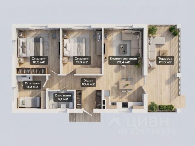 Второй этаж — холл 11 кв.м, спальня 25,8 кв.м, спальня 16,7 кв.м м с выходом на просторную лоджию 7 кв.м.