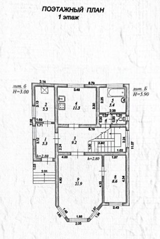 На первом этаже: прихожая, 2 кухни, гостиная, 4 жилые комнаты, несколько санузлов, котельная и кладовая.