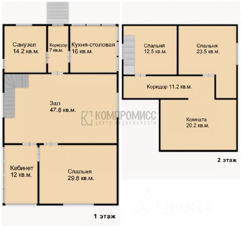 Второй этаж — холл 11 кв.м, спальня 25,8 кв.м, спальня 16,7 кв.м м с выходом на просторную лоджию 7 кв.м.