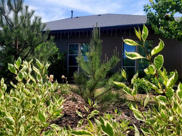 Стены газоблок 375мм D400. Мягкая кровля Большие окна в пол фирмы Shuko (металлопластик) Межкомнатные двери Sofia Входная дверь Torex На участке большое количество плодовых деревьев и кустарников , выделена зона огорода с высокими грядками, детские качели , газон,ландшафтный дизайн.