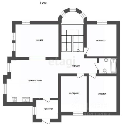 Планировка 1й этаж терраса (26.4) , прихожая (6.4), кухня (31) + каминный зал (22) , коридор с лестницей (31) , котельня (16) , с.у, с душем (5.3) , кладовая (18), винодельня (мастерская) с отдельным входом (15). Лестница расположена в круглой средневековой башне высотой более 9 метров, кованные светильники и карнизы. Кухня из массива ясеня, техника Liebherr, Zigmund&Shtain, Gorenij, Blanco.