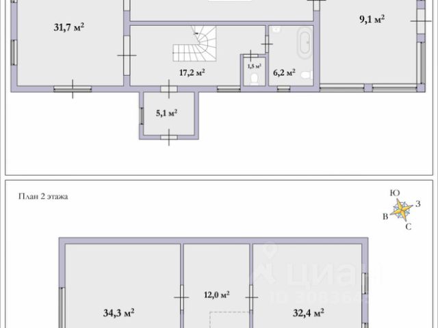 На втором этаже расположены две изолированные спальни 34,3+32,4 кв.м., ( одну из спален при желании можно разделить и сделать дополнительную комнату ) вместительная гардеробная и холл.
