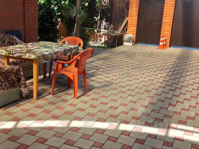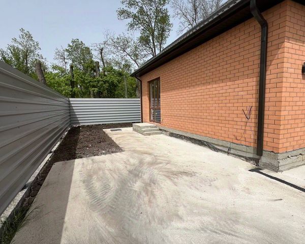Придомовая территория благоустроена: двор выложен плиткой, парковочные места, дорожки, отмостка по периметру дома, зона отчуждения также выложена плиткой.