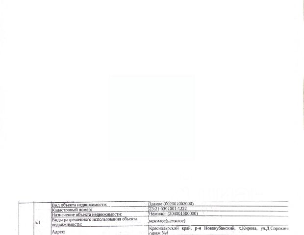 Данные получены с сайта ГИС Торги. Д-к: Королева Ю.В. Здание нежилое (гараж), площадь 34,1 кв.м., кадастровый номер 23:21:0301001:1222, земельный участок, площадь 38 кв.м., кадастровый номер 23:21:0301001:1104 (для размещения индивидуальных гаражей). Адрес: Краснодарский край, Новокубанский район, с/п Верхнекубанское, х. Кирова, ул. Д. Сорокиной, 7/1, гараж 4. Начальная цена 324 700 руб., задаток 48 705 руб., шаг аукциона 3 247руб., ув. 1191.
