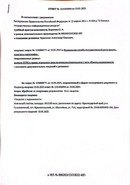 Д-к: Кравченко А.П. Земельный участок, площадь 2012 кв.м., кадастровый номер 23:06:0301052:156. Адрес: Краснодарский край, Гулькевичский район, пгт. Красносельский, ул. Шоссейная, участок 71 А. Начальная цена 1 257 065 руб., зад...