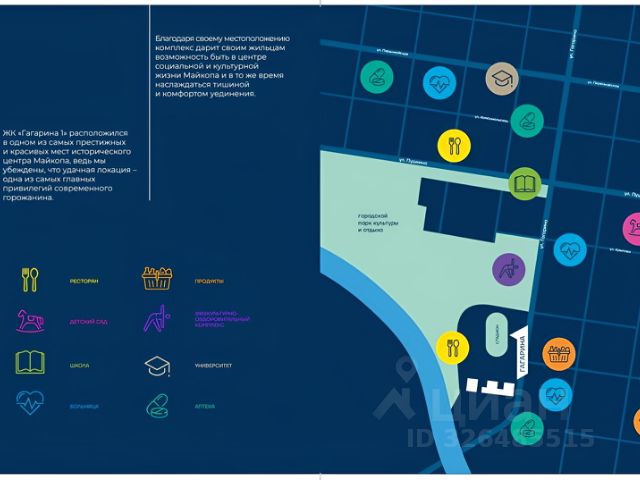 Жилой комплекс состоит из 2 кирпично-монолитных корпусов высотой 16 этажей. Фасады облицованы кирпичом, в подъездах выполнена дизайнерская отделка. На первом этаже предусмотрены помещения для хранения колясок. В каждом корпусе установлены пассажирские и грузовые лифты. В проекте представлены квартиры с 13 комнатами, с панорамными окнами и потолками высотой 2,65 метра. Жилье передается без отделки, в черновом варианте: выполнены базовые строительные работы, включая возведение стен. На стилобатной части комплекса обустроены озелененные дворы, детские и спортивные площадки. Территория организована по концепции без машин. Предусмотрены крытый паркинг на 100 мест и открытая парковка, а также освещенные тротуары. Безопасность обеспечивается видеонаблюдением и контролем доступа на территорию. Для дополнительного комфорта жильцов доступен сервис консьержа и система умного дома. Комплекс расположен в поселке Яблоновский Республики Адыгея. В 5 минутах пешком находится остановка общественного транспорта Космическая улица. В радиусе 515 минут находятся школы, детские сады, кафе, магазины, аптеки, салоны красоты и пункты выдачи. До центра Краснодара, где находятся театры, музеи и культурные достопримечательности, можно добраться за 20 минут транспортом.