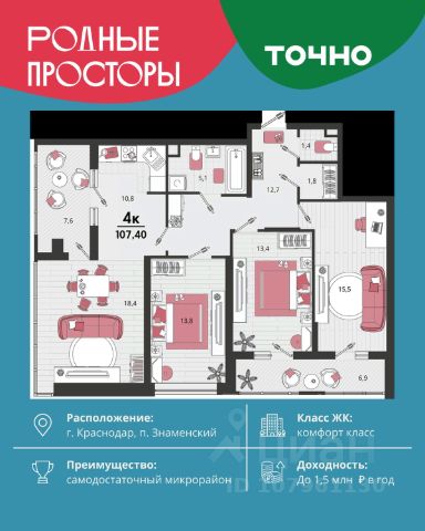 Жилой комплекс "Первое место" — современный проект, возведенный по технологии монолитного строительства с фасадами, облицованными штукатуркой с подсветкой в ночное время. Дома квартала имеют переменную этажность, что позволяет сформировать разнообразную архитектурную среду. В здании имеются пассажирский и грузовой лифты, дизайнерские холлы с зонами отдыха, колясочные и кладовые для хранения сезонных вещей. В проекте представлено множество планировочных решений — от студий до просторных 4х-комнатных квартир как в классических, так и в европланировках, в том числе имеющие мастер-спальни, ниши для шкафов и стиральных машин, встроенные лоджии с панорамным остеклением. Лоты сдаются с черновой и чистовой отделкой, высотой потолков до 3 метров и увеличенными окнами. Территория комплекса благоустроена: имеется двор с ландшафтным дизайном, места для активного времяпрепровождения и отдыха, зоны выгула собак. Развита социальная инфраструктура внутри комплекса — имеются школы, детские сады, медицинские и спортивные учреждения. Для автовладельцев предусмотрен подземный паркинг. Жилой комплекс "Первое место" располагается в новом районе города — Новознаменском, в Карасунском округе северо-восточной части Краснодара, и имеет выезд на трассы М4 "ДОН" и "Джубга-Сочи" в направлении Черного моря и горнолыжных курортов. В пешей доступности находятся продовольственные магазины, торговые центры, медицинские и образовательные учреждения, кафе и рестораны. До цента краснодара — 30 минут. Квартира, примерная площадь 100 м2 в Краснодарском крае.