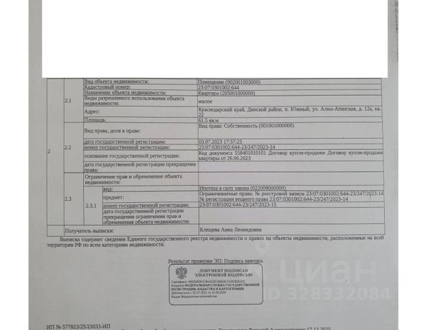 Данные получены с сайта ГИС Торги. Д-к: Кварчия М.З. Квартира, площадь 61,5 кв.м., кадастровый номер 23:07:0301002:644. Адрес: Краснодарский край, Динской район, п. Южный, ул. Алма-Атинская, д. 12 А, кв. 22. Начальная цена 3 786 240 руб., задаток 3 787 руб., шаг аукциона 37 863 руб., ув. 93