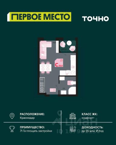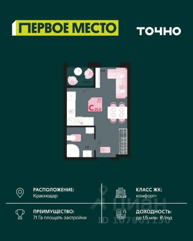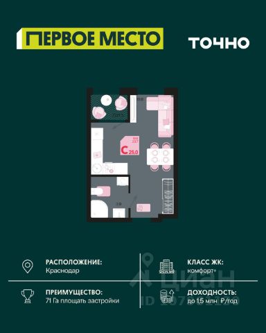 Жилой район "Первое место"- один из самых масштабных проектов в России. На территории 71 га 18 кварталов, 31 дом переменной этажности от 8 до 18 этажей, собственный парк 9 га, храмовый комплекс, пешеходный бульвар "Круг семьи", детские и спортивные площадки, мангальные зоны и различные локации для отдыха. В шаговой доступности действующие муниципальные образовательные учреждения: школа на 1 100 мест и детский сад на 250 мест. Помимо этого, в жилом районе "Первое место" построятся школа на 1700 мест с крытым 25-метровым бассейном и 5 детских садов на 1 490 мест. На первых этажах многоуровневых парковок "паркхабов" разместится более 61 тыс м2 коммерческих помещений. Жителям будут доступны собственный фитнес-центр, кафе, рестораны и магазины. В каждом подъезде предусмотрены дизайнерские холлы в стиле лобби отелей, консьерж-сервис, лапомойки, отдельные колясочные и велосипедные. Также в домах будут просторные кладовые помещения и комнаты для хранения почты с почтоматами для получения посылок из маркетплейсов. Продается квартира 25 м2 в Краснодаре.