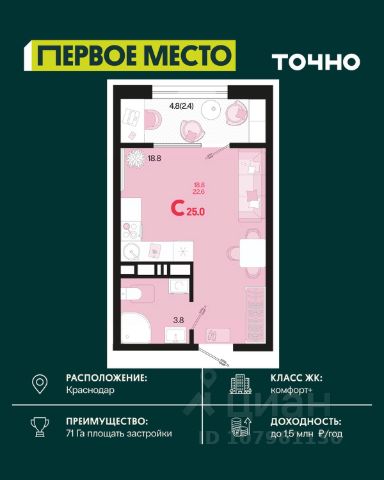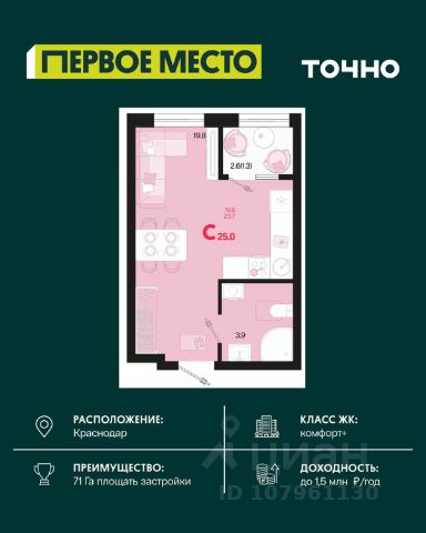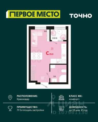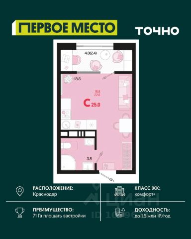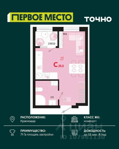 Жилой комплекс "Первое место" — современный проект, возведенный по технологии монолитного строительства с фасадами, облицованными штукатуркой с подсветкой в ночное время. Дома квартала имеют переменную этажность, что позволяет сформировать разнообразную архитектурную среду. В здании имеются пассажирский и грузовой лифты, дизайнерские холлы с зонами отдыха, колясочные и кладовые для хранения сезонных вещей. В проекте представлено множество планировочных решений — от студий до просторных 4х-комнатных квартир как в классических, так и в европланировках, в том числе имеющие мастер-спальни, ниши для шкафов и стиральных машин, встроенные лоджии с панорамным остеклением. Лоты сдаются с черновой и чистовой отделкой, высотой потолков до 3 метров и увеличенными окнами. Территория комплекса благоустроена: имеется двор с ландшафтным дизайном, места для активного времяпрепровождения и отдыха, зоны выгула собак. Развита социальная инфраструктура внутри комплекса — имеются школы, детские сады, медицинские и спортивные учреждения. Для автовладельцев предусмотрен подземный паркинг. Жилой комплекс "Первое место" располагается в новом районе города — Новознаменском, в Карасунском округе северо-восточной части Краснодара, и имеет выезд на трассы М4 "ДОН" и "Джубга-Сочи" в направлении Черного моря и горнолыжных курортов. В пешей доступности находятся продовольственные магазины, торговые центры, медицинские и образовательные учреждения, кафе и рестораны. До цента краснодара — 30 минут. Продается квартира 25 м2 в Краснодаре.
