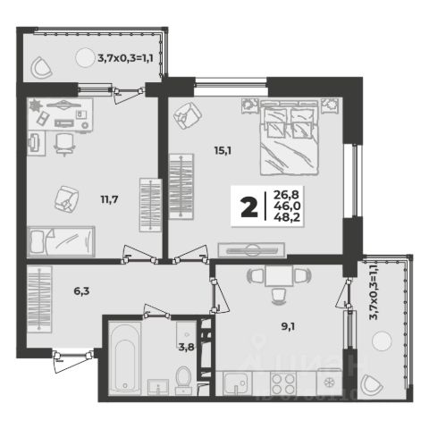 Квартира общей площадью 49,1 кв.м современной планировки, где прихожая 9,3 кв.м, совмещенный санузел 3,7 кв.м, комната 15 кв.м, кухня-гостиная 14,3 кв.м, ленточная лоджия 6,8 кв.м.