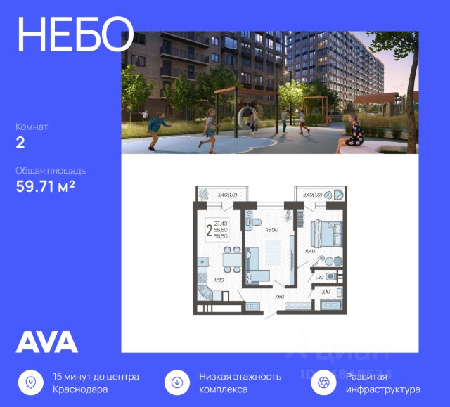 Жилой комплекс полностью сдан! В спокойном тихом районе Краснодара, утопающем в зелени, продается 2-комнатная квартира площадью 58.5 кв. м. Квартира расположена на 1 этаже, в жилом комплексе комфорт-класса "Небо". Девелопер проекта - компания AVA. "Небо" - идеальное место для жизни между небом и землей. Рядом парк, развитая инфраструктура, школы, детские сады, медицинские учреждения. Этот жилой комплекс - мечта для людей со спокойным ритмом жизни, ценящих уют и тишину почти в центре южной столицы. Транспортная доступность и окружение • 7 остановок общественного транспорта в шаговой доступности; • ПКиО имени 300-летия полиции России в 5 минутах пешком; • Парк "Патриот" с фонтаном в 10 минутах пешком; • Рядом улица Дзержинского - одна из основных магистралей Краснодара; • Удобный и быстрый выезд в центр города. Особенности архитектуры Жилой комплекс "Небо" - это 8 уютных 12-этажных домов с монолитным фундаментом. Фасад выдержан в бежевых и светло-коричневых тонах, легкости архитектуре придают лоджии с панорамным остеклением и "французские" окна. Достаточно большое расстояние между домами обеспечивает удобство перемещения во дворе и красивые виды из окон каждой квартиры. "Небо" - идеальный баланс комфорта и функциональности. Благоустройство территории Живописные дворы жилого комплекса "Небо" утопают в зелени - это идеальное место, где родители могут отдохнуть в тишине, пока их дети резвятся на ярких качелях и горках. Для маленьких жителей, подростков и спортсменов здесь расположены уникальные игровые зоны: площадки с развивающими малыми формами для игр, уютные качели-гнезда, веревочные комплексы, уличные тренажеры и многое другое. Входные группы Яркие небесные акценты в оформлении входных групп подчеркивают общую стилистику жилого комплекса. В каждом подъезде предусмотрены колясочные, дизайнерские лифты и круглосуточное видеонаблюдение. Другие преимущества: • Закрытая территория • Своя коммерция на первых этажах; • 2 подземных паркинга на территории ЖК; • Наземный 9-этажный паркинг; • Торговый центр, супермаркет и ВУЗ в шаговой доступности.