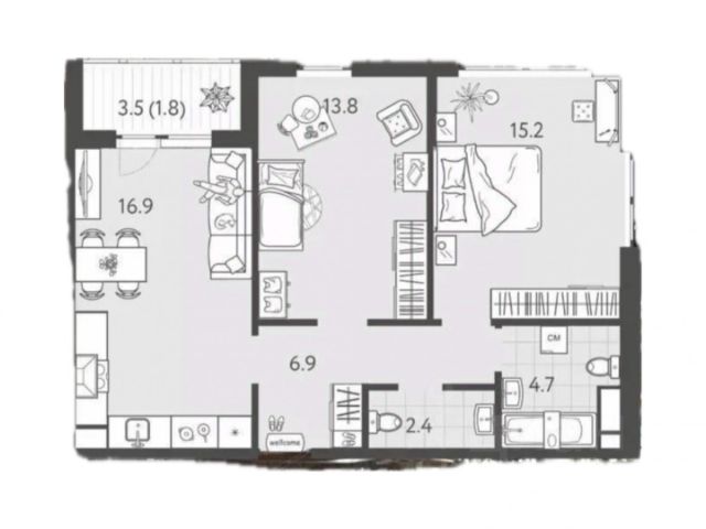 — 4 комнаты с гибкими вариантами зонирования (возможна реализация 2 больших спален + просторная кухнягостиная).