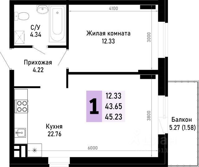 Продаётся 1-комнатная квартира в строящемся доме (Литер 4), срок сдачи: IV-кв. 2026, общей площадью 45.23 кв.м., на 1 этаже. Новый жилой комплекс по ул. Николая Лебедева от застройщика "ССК"