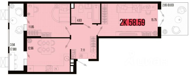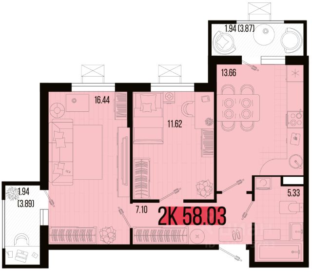 Площадь: 42,1 кв.м.