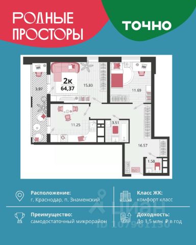 В продаже 2-комнатная квартира от застройщика! ЖК "Рекорд" 2 очередь, г. Краснодар, Литер 2 Срок сдачи: 4 кв. 2026, общей площадью 57.3 кв.м., на 12 этаже. Жилой Комплекс "РЕКОРД" - место вашего баланса. Город снаружи природа внутри. Квартал с максимумом возможностей для хорошо сбалансированной жизни. Расположен в оживленном благоустроенном районе города. Сочетает в себе и жилую застройку, и торгово-деловые центры. Здесь все под рукой, здесь центр городских событий. • Уникальная локация центр города • Современная архитектура • Панорамные виды • Двухуровневые квартиры с камином и террасой • Элегантные входные группы • Архитектурная подсветка фасадов • Школа во дворе (1550 мест) • Детский сад во дворе (110 мест) • Двор без машин • Подземный паркинг и гостевые парковки • Круглосуточный пост охраны • Медицинский центр • Фитнес центр • Система "умный дом" • Баскетбольная и универсальная спортивные площадки • Современные развивающие детские игровые площадки • Ресторанный дворик с аллеей и фонтаном • Храм с уникальной архитектурой • Премиальные лифты с подсветкой и музыкой • Звукоизоляционные окна • Зарядные устройства для электромобилей • Ароматизация мест общего пользования • Элегантные входные группы • Дизайнерские лобби • Консьерж сервис • Сквозные подъезды и доступ по Face ID • Кладовки • Кондиционирование холлов • Благоустройство территории с Арт объектом • Воркаут-зоны • Зона коворкинга • Wi-fi и USB розетки на всей территории двора Приобрести квартиру можно одним из способов: -субсидированная семейная ипотека 4,5 % на весь срок -рассрочка до конца строительства -оплата наличными -дистанционная покупка Позвоните сейчас и забронируйте квартиру со скидкой!