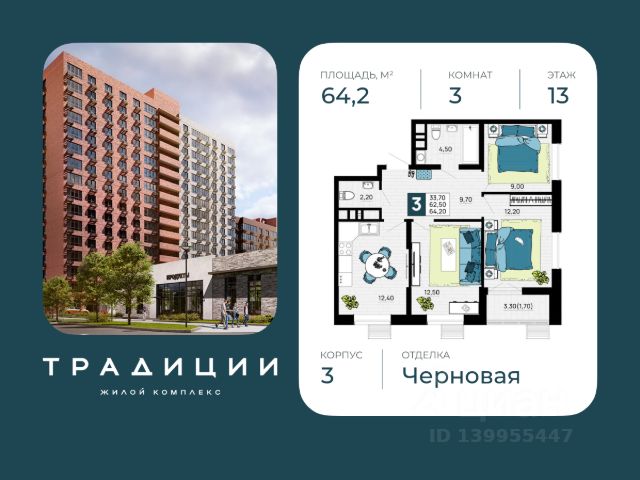 Литер 3, 13 этаж, 123. ЖК "Традиции" - это новый современный комплекс на 7 гa, в 10 минутах от Краснодара. Баланс города и природы. Вся необходимая инфраструктура в пешей доступности Инфраструктура комплекса: Продуманная среда для жизни Всё для детей всех возрастов Современные детские площадки Действующая новая школа на 1100 мест в 70 метрах Свой двор-парк и сквер Падел-теннис и корт во дворе Двор без машин Современная архитектура Безбарьерная среда Воркаут-зона Система видеонаблюдения для безопасности Просторные и лаконичные холлы Многоуровневый паркинг Спортивные площадки для любых видов тренировок Универсальные спортивные площадки для любых видов тренировок Зона для настольных игр Волейбольная площадка и баскетбольная площадка Уютные зоны отдыха для жителей Колясочные и места для хранения велосипедов Трёхуровневое озеленение Позвоните сейчас и забронируйте квартиру со скидкой!