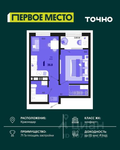 В продаже 1-комнатная квартира от застройщика! ЖК "Рекорд" 2 очередь, г. Краснодар, Литер 1 Срок сдачи: 4 кв. 2026, общей площадью 41.6 кв.м., на 15 этаже. Жилой Комплекс "РЕКОРД" - место вашего баланса. Город снаружи природа внутри. Квартал с максимумом возможностей для хорошо сбалансированной жизни. Расположен в оживленном благоустроенном районе города. Сочетает в себе и жилую застройку, и торгово-деловые центры. Здесь все под рукой, здесь центр городских событий. • Уникальная локация центр города • Современная архитектура • Панорамные виды • Двухуровневые квартиры с камином и террасой • Элегантные входные группы • Архитектурная подсветка фасадов • Школа во дворе (1550 мест) • Детский сад во дворе (110 мест) • Двор без машин • Подземный паркинг и гостевые парковки • Круглосуточный пост охраны • Медицинский центр • Фитнес центр • Система "умный дом" • Баскетбольная и универсальная спортивные площадки • Современные развивающие детские игровые площадки • Ресторанный дворик с аллеей и фонтаном • Храм с уникальной архитектурой • Премиальные лифты с подсветкой и музыкой • Звукоизоляционные окна • Зарядные устройства для электромобилей • Ароматизация мест общего пользования • Элегантные входные группы • Дизайнерские лобби • Консьерж сервис • Сквозные подъезды и доступ по Face ID • Кладовки • Кондиционирование холлов • Благоустройство территории с Арт объектом • Воркаут-зоны • Зона коворкинга • Wi-fi и USB розетки на всей территории двора Приобрести квартиру можно одним из способов: -субсидированная семейная ипотека 4,5 % на весь срок -рассрочка до конца строительства -оплата наличными -дистанционная покупка Позвоните сейчас и забронируйте квартиру со скидкой!