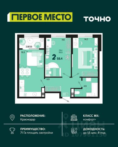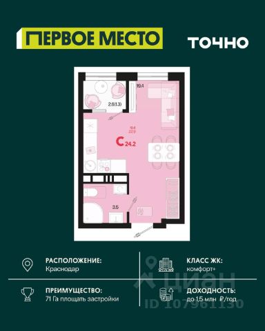 Продаются 1-комнатные апартаменты в сданном доме (Дом 75/6), срок сдачи: II-кв. 2023, общей площадью 22 кв.м., на 15 этаже. Апарт-отель The Grand Palace - новая точка притяжения на карте Краснодара. Проект формирует особенный облик деловой части города и вдохновляет его жителей. Апарт-отель - это новый для Краснодара формат жилья, где можно постоянно жить в более комфортных, чем в обычном доме условиях самому и с семьей или купить готовые апартаменты с ремонтом в качестве инвестиции для сдачи в красткосрочную или долгосрочную аренду. От обычного жилого комплекса апарт-отель отличает собственная внутренняя инфраструктура. Резидентам апартаментов доступны услуги зоны SPA и фитнеса, медицинского консьержа, ресторана авторской кухни, прачечной и клининга, коворкинга и лобби-бара. Все апартаменты продаются с ремонтом под ключ! Единый архитектурный стиль и продуманный до мелочей дизайн всех помещений и апартаментов надолго останется актуальным. Инфраструктура - На расстоянии менее 1 км. находятся крупнейшие торгово-развлекательные центры : СБС Мегамолл с кинотеатром, ресторанами, кафе, ТРК Галактика. - Рядом 2 premium фитнес-центра с бассейнами 50 GYM и X-FIT - 10 минут пешком. - Удачный район не только для отдыха, но и бизнеса: с оптовыми базами, офисными центрами, складскими помещениями. - Удобная транспортная развязка с выездом в любой район города, аэропорт и на трассу М4 к морю. - Множество остановок общественного транспорта, в том числе маршруток и трамвая в любой конец города. 15 минут пешком до детского сада и школы 24 Всё это обеспечит повышенный интерес и постоянный спрос на апартаменты, что гарантирует стабильный доход от рентабельной недвижимости в Краснодаре, цена на которую будет только расти.